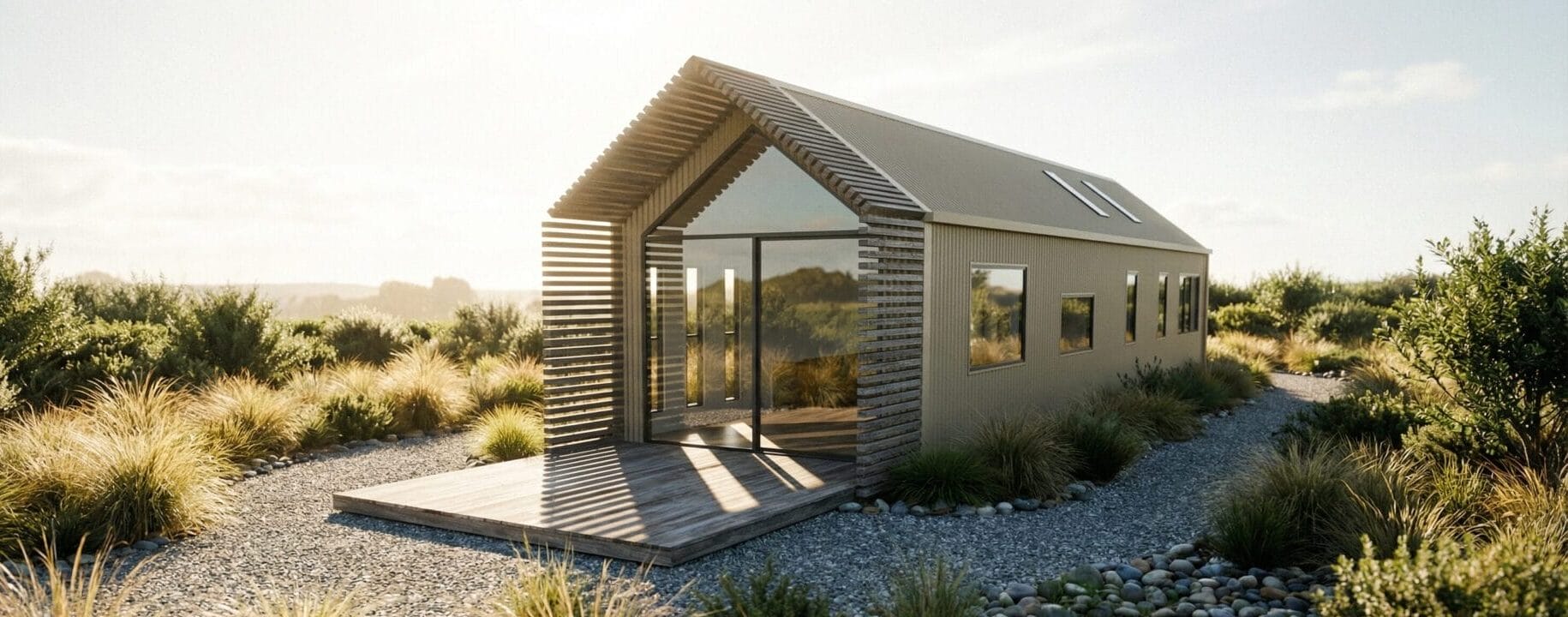 Every Everest we build is completely custom so can be designed anywhere between 45m2 – 70m2 as a one, two or even three bedroom space, and can feature a large glass end wall as shown on the rendered images. The Everest can be as long and wide as you would like. It can be moved to site with a low loader truck.
